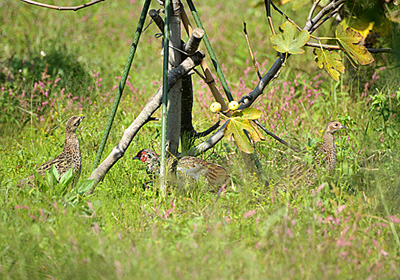 ノビタキが来ていた植木畑をウロウロしていると隣の原っぱで雌のキジを目撃。辺りを見ると1羽の雄と3羽の雌で皆若鳥のようだ。雌は若鳥と成鳥の見分けが難しかったので親鳥が混じっていたかもしれない。写真には3羽見られ真ん中が雄の若鳥。