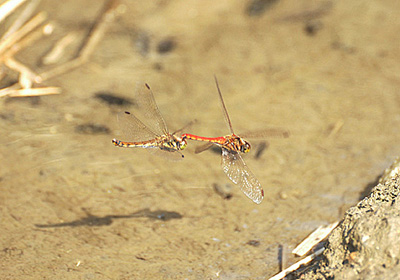 先月22日に今年初めてアキアカネを見たが、それから一ヶ月、この日好天気でアキアカネの産卵が見られた。稲刈りが終わった田んぼの脇に流れる溝で雌雄連結しながら水面を打ちつけての産卵。