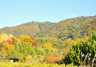 昔の炭焼き用のクヌギや桜の樹が植わる山は色づき始め、ふもとのイチョウやモミジも色づき里山全体が色のハーモニーを奏でている。