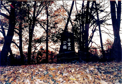 千里北公園の金蘭学園側の登り口、コナラやクヌギなどの落ち葉で、じゅうたんを敷きつめたようだ。散策するのにクッションもよくて快適な気分にさせてくれる。 登り口には末の枯れ木を利用して公園名が彫られている。