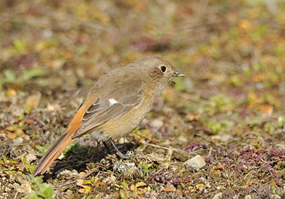 ジョウビタキが地上に下りて餌を啄んでいるのはよく見るが、いつも何を食べているのか確認する事が出来なかった。この日はジョウビタキの雌が地面で餌を採っているところを物陰に隠れてじっくりと観察していた。 何回も地面を突っついているので何かを採っているのは確かだが小さくて判らない。ただこの写真では餌を咥えてから落とした瞬間で何かの種である事が判った。