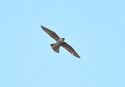 ノスリが上空で舞っていたが、その方向に近くからハヤブサが舞い上がった。そのあとを数羽のカラスが追っかけていたが、タカが舞う下には餌になる鳥でもいたのであろうか。 ハヤブサは翼が細長く、それと何と行ってもひげ状の黒斑が特徴で、タカ科の仲間とはちょっと違う 。