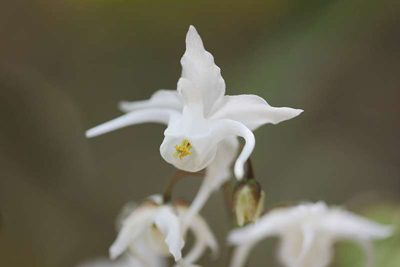 イカリソウの開花期は4〜5月。花の四方に伸びた角のような いかりの鉤にあたる部分は「距(きょ)」と呼ばれる器官で、 これは花弁の一部が袋のように変化したもの。 距の中には、花粉を媒介する昆虫をおびき寄せるための蜜が 入ってる。