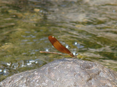 ミヤマカワトンボがのんびり日向ぼっこをしていました。さわやかな晴れた川辺の風景です。