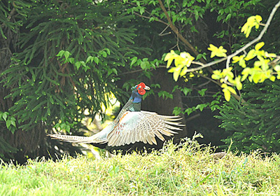 このところ、あの金属音のような雄キジの鳴き声をあちこちで聞く。この日も土手の上でほとんど動かず、前を見据えて何度か鳴き叫んでいた。 鳴く前に体を半回転ほど動かし、前を向いてあくびのように一回口をあけて、その後に一連の雄叫びが始まる。この前動作、この個体だけのものなのかどうかは判らないが、2度とも同じ動作をしていた。雄叫びは金属音のような「ケーッ ケェーッ」という叫び声で、直後に翼を羽ばたかせた「ブルルル・・・」という音が聞こえてくる。