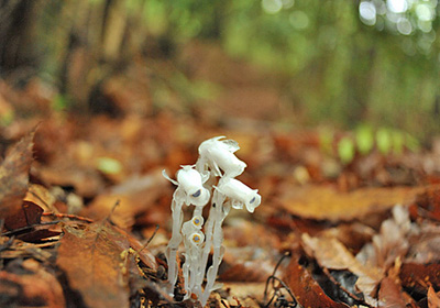 4月の中ごろギンリョウソウが雑木林の林床の枯れ葉から覗いているのを見たが、この日このところの雨のためかあちこちに頭を出し花を咲かせていた。葉緑素を持たず全体が白いので青い雌しべと黄色い雄しべがいっそう目立って見えている。