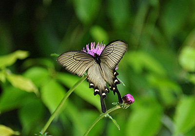ジャコウアゲハの♀がノアザミの花で吸蜜していた。この場所には幼虫の食草であるウマノスズクサが数株生えていて、葉には既に産み付けられた卵が見られる。 写真の雌はこの周辺の狭い範囲を低空で行ったり来たりしていたが、産卵の気配は全くなかった。