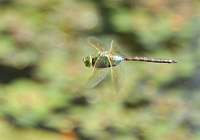 ほとんどの溜池でクロスジギンヤンマとトラフトンボの縄張り飛行が見られるが、今年は例年になく数が少ない。ギンヤンマも毎年見ている羽化が見られずどうなっているのかと思っていたが、この日縄張り飛行しているところを今年初めて見ることになった。 トラフトンボと違ってギンヤンマの縄張り飛行は池のど真ん中で端から端までの間を悠然と飛行している。