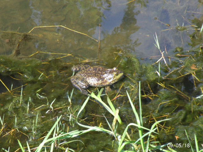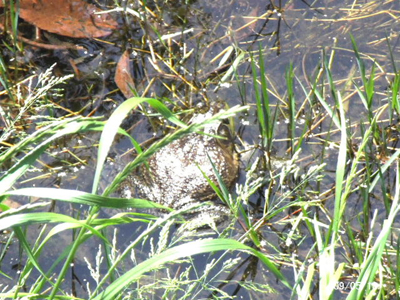 ![]() 13:03 決着が付き、侵入者が白旗揚げて退却。勝鬨を上げる先住のウシガエル(左)。追撃、深追いせず。 |