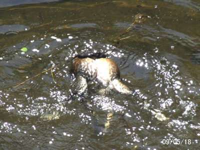 ![]() 午前9:34 西明寺川:宝塚市 この場所を以前から占有している ウシガエル。 | ![]() 13:01 この占有地に、他から侵入してきたウシガエル。雌雄を決するべく、近距離で鳴き合戦を挑む。 | ![]() 13:02 鳴き合戦では決着付かず、突然肉弾戦に入る。体勢不明 |