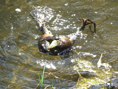 これにて、ウシガエルの戦い現場からの実況放送終わります。 撮影者: 長岡 一夫 撮影場所: 宝塚市最明寺川 (2009.5.18.) 目次へもどる / 次の写真へ |