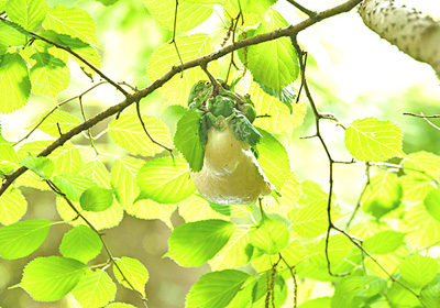 モリアオガエルの産卵はどちらかというと雨か曇りの日で明け方が多いようだが、晴れたこの日は午後一時過ぎてまだ産卵の真っ最中。それも雌一匹に雄が5匹以上参加の産卵で大盛況。今年はモリアオガエルの卵塊の数が多く大きいのが目立つ。