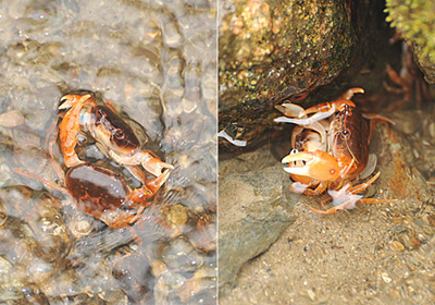 小川の流れの真中でサワガニの雄が両方の鋏で雌の鋏を掴みダンスでもしているかのように動いているのが見られた(写真左)。その後雄が雌を石の隙間にエスコートして、そこでもみ合っているうちに雌が腹部(いわゆる“ふんどし”)を開きその間に雄が乗るかのような姿勢になり交尾が始まった(写真右)。 雌は仰向けで水中に没した姿勢。交尾開始から50分ほど過ぎてようやく雌が起き上がり、あっという間に流れの方に離れて行った。