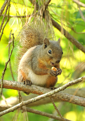 山道を歩いていると何か小さな動物が茂みに入ったような気がした。近づいてみるとニホンリスが何かを両手で掴み食べていた。こちらに気が付き真上の松の樹に登り再度食べ始めた。こちらが間近で写真を撮っていたが食べるのに夢中なのかそのまま食べ続け、逃げる様子はなかった。 写真を見ると食べていたのはキノコだった。