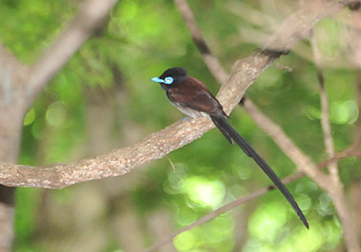 6月1日に初めて確認したサンコウチョウ、この日も杉林と落葉樹の境に数羽が何度も訪れていた。見ているとほとんどの場合雌が入っていて求愛ディスプレイのような行動が度々見られた。 サンコウチョウは独特の鳴声と雄は長い尾があるので、暗闇の中でも本種と認識出来る。写真を撮るのには条件が悪いのでフラッシュを使ったが、光にはあまり反応しないようだ。羽づくろいもしていたのでこちらをあまり意識していないようだ。