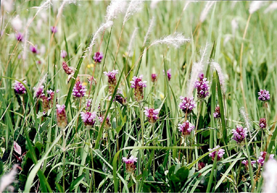 緑の中で、チガヤの白とウツボグサの赤紫色のコントラストがすばらしい。