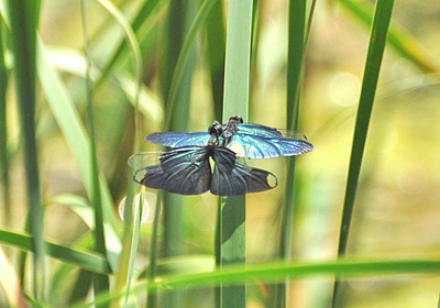 今年はどうしたことかチョウトンボが多く発生している。ヒメガマの生えるこのため池では40頭近くが飛交い、縄張り争いや雌を追いかける行動があちこちで見られる。 交尾も度々見られるがその交尾時間が数秒と極めて短時間なので、じっくり観察出来ず写真を撮るのもけっこう難しい。 写真ではとまって交尾しているが空中で交尾する場合はさらに撮るのが難しくなる。