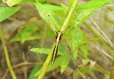 ミヤマアカネのマーキング調査中、同じ草むらでトンボのようなものが飛び出した。よく見ると形はトンボに似ているがトンボの仲間(トンボ目)ではなく、脈翅目ツノトンボ科のツノトンボであった。 4枚の透明な翅は一見トンボを思わせるが、触覚は長く先端が膨らんでいてチョウの触角のように見える。