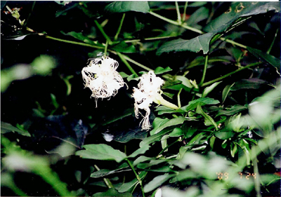 千里北公園の苗圃(びょうほ)の中でキカラスウリが白いレース状の花をつけていた。