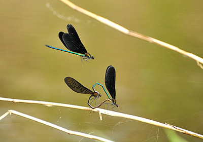 余野川の水際には縄張り争いをしているハグロトンボが多く見られる。 雄はしょっちゅう動き回っている。雄同士の縄張り争いであったり、雌の争奪戦だったりと忙しい限り。 写真は先に交尾したペアーに他の雄がアタックをかけているところ。執拗に間に入ってくるので交尾中の雄(交尾している右側)は翅をバタつかせて護るしかない。攻撃する雄は最後には雌の翅の上に乗り邪魔している。 こんな動作を何回か繰り返すうちにペアーはとうとう離れてしまった。