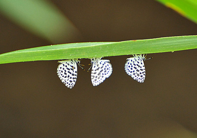 林縁にある薄暗い溜池の周辺に生える笹の葉の裏に小さなゴイシシジミがとまっていた。1頭であれば気が付かなかったであろうが、3頭並んでいたので目についた。 辺りを探すと全部で5頭確認できた。もしかすると羽化後間もない個体群であったのかもしれない。