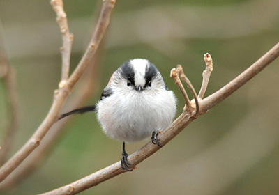 10羽以上のエナガの群に出遭い、中にシジュウカラ、メジロも混じった混群。エナガはしきりに枝で何かを啄んでいるが小さいので何を食べているのか判らなかった。