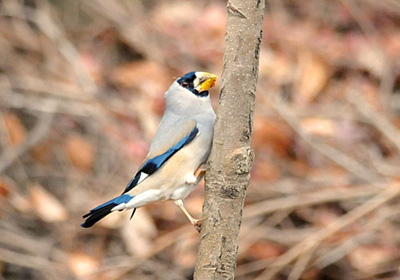 この日今期初めてイカルに出遭った。 例年なら群で見るのが多いが、この日は群でなく一羽で行動していた。最初樹の上にいて採食していたが、そのうち近くの地上に降りて地面で何かを啄み始めた。その方に近づくと気がつかれて樹に逃げられてしまった。写真はその樹に逃げた時のもの。