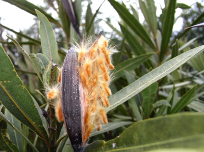 盛夏の頃、深紅の一重花を沢山に咲かせていた木です。 今、晩冬の陽が当たり、堅い袋果が弾け、中から産毛坊やが 跳ねだしていました。 キョウチクトウ(キョウチクトウ科 夾竹桃)の種子です。 遠くへ運んでくれる春一番の風待ちのようです。