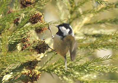 今年はヒガラが良く見られる。いつも見るのはアカマツの樹でその種子が目当てでヤマガラと共によく訪れている。この日はいつもの場所と別のところでヒガラの群に遭った。群で移動しながら採食しているようだ。写真は植木畑に植わっている杉の種子を啄んでいるヒガラ。ヒガラは松の実以外に杉の実も好物のようだ。 撮影者:横田 靖さん 撮影場所:池田市東山町(2011.01.12) 前の写真へ / 目次へもどる / 次の写真へ |