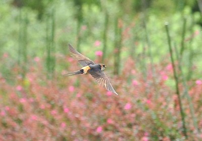 コシアカツバメが植木畑の上をすれすれに飛んで摂食飛翔していた。 100mほどのところを行ったり来たりしている。川の上で摂食飛翔しているのもよく見られる。 本種は名前のように腰の部分がオレンジ色なので飛んでいると普通のツバメと区別出来る。