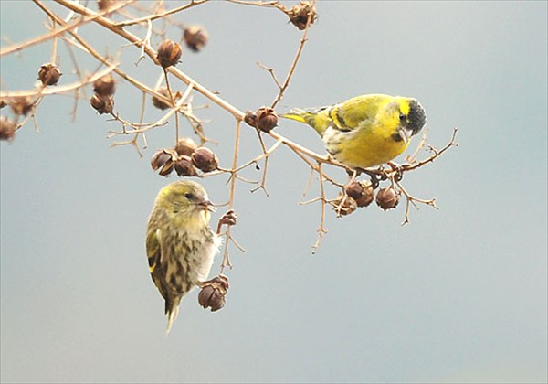 40羽近くのマヒワの群がサルスベリの実を食べているのに遭う。見ていると完全に群で行動している。飛び立つのも移動方向も一斉に同じように動き、まるで海の小魚の群のようだ。 撮影者:横田 靖さん 撮影場所:池田市伏尾町(2013.01.21) |
