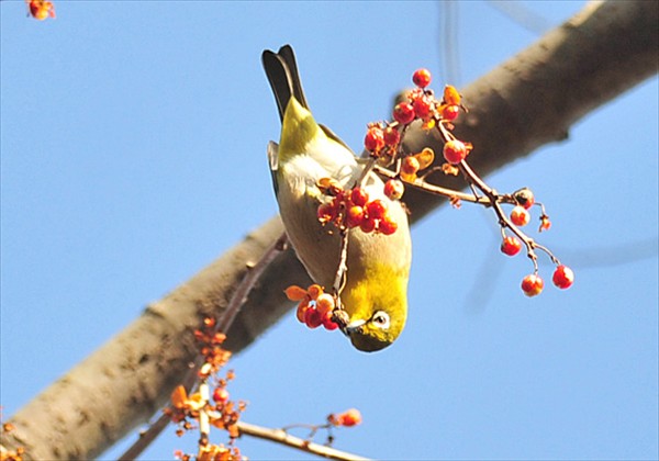 ツルウメモドキが好物のウソが来ていないかと樹を見上げているとメジロが群で実を食べていた。メジロはいろいろな姿勢で実を啄む姿を見せてくれた。 撮影者:横田 靖さん 撮影場所:池田市伏尾町(2013.01.07) |