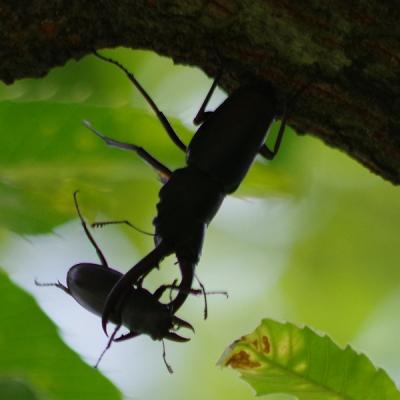 梅雨の合間を利用して里山散策。ノコギリクワガタが出現しはじめました。見つけたノコギリクワガタを見続けていると前方からもう1匹が出現。やや小ぶりな方が進路を変えて過ぎ去ろうとしましたが、大きな方が向きを変えて襲いかかりました。