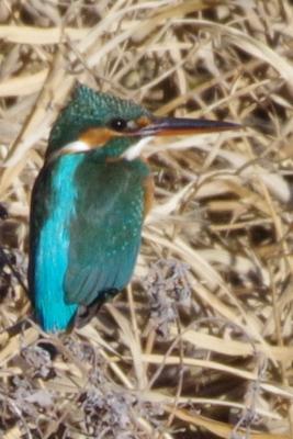 強風が吹く川原で枯草にとまるカワセミ。強風で頭部の毛がたっていました。7