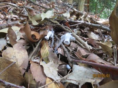 植生保護柵を巡回していると足元に白いものが、葉緑体をもたない別名ユウレイタケが、菌類に寄生しているだけに周囲にもいくつか咲いていた。