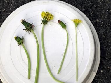 | 木村コメント: これらのタンポポの写真は、今回のタンポポ調査の段階でいうと、写真Aは左から4・3・2・2・1となり、写真Bは左から1・2・3・3・4になると思います。 また、実物とその花粉を観察していないので断定できませんが、写真を見る限りでは、写真Aの段階1(右端)のものは頭花も小さく「カンサイタンポポ」と思われますが、写真Bの段階1(左端)のものは、在来種型の雑種のように見えます。ぜひ頭花をお送りください。 堺市での私の観察では、段階2のものが見つかるとその近くに段階2〜3のタイプのものがいっしょに見つかることが多く、これらはたぶん同じ個体から由来するものだと思います。 なお、都心部では(在来種と接触する機会が少ないためか?)段階4・5のようなものが多く、河内長野のように周辺が在来種の生育地に、新しく外来種が侵入したような地域で段階2・3のようなタイプが多いようです。このようなタイプのタンポポの花を見つけられて、同じ株に痩果(タネ)もできておれば、ぜひいっしょにお送りください。 |