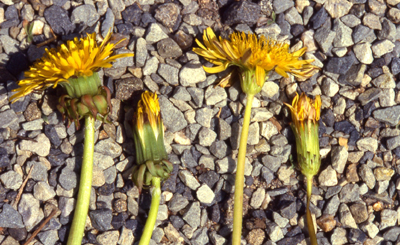 典型的なセイヨウタンポポ(左:総苞外片が完全に反り返っている)とカンサイタンポポ(右、総苞外片は上向きで内片に密着している)