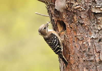 コゲラの巣が完成した日から推測すると前日あたり孵化するのではと予想していたがあいにくの雨。この日行ってみるとコゲラが餌を運んでいた。少なくとも1羽は孵化したようで、様子からまだ孵化していない卵もあるようだ。