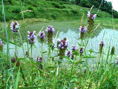 昨年は休耕田だった棚田に今年は水が入りました。 水に映る空・雲・木・草、それに・・・・・・・。 すべてが水によってつながりました。 今花咲くウツボグサ(靭草)は梅雨明けとともに カコソウ(夏枯草)となる。