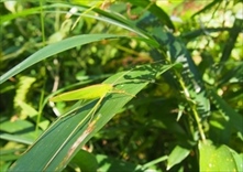 草の葉の上には緑色のセスジツユムシ(バッタの仲間)。褐色型もある。 |