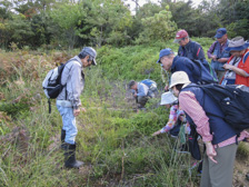 草原の水分の多い場所に自生するコモウセンゴケを観察する受講生。写真の上にマウスを置くと、コモウセンゴケが見える。 |