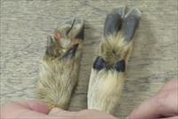 イノシシの足(左)とシカの足(右)の標本。偶蹄目の動物は4個のひづめを持っている。先端の2個を主蹄、後方の2個を副蹄という。主蹄はヒトの薬指と中指、副蹄は小指と人差し指に当たるそうだ。彼らはまさに爪先で走ったり跳んだりしているのだ。